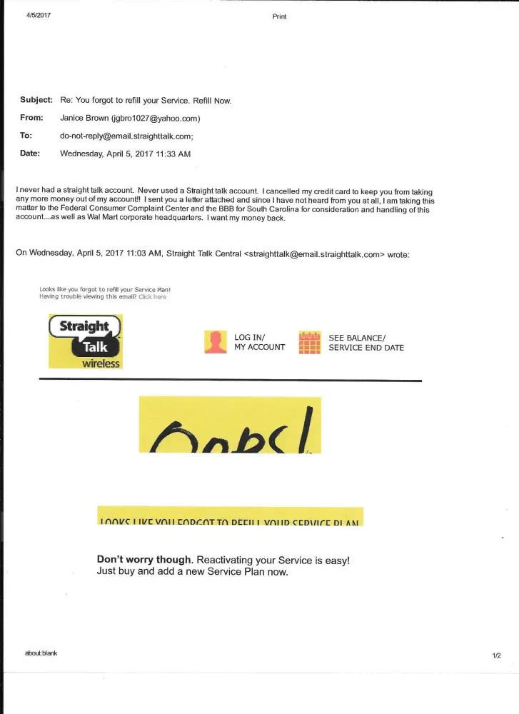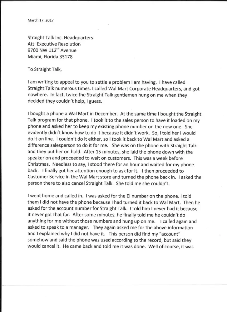 TracFone's company, Straight Talk refuses to talk to me or answer my letter regarding problems I am having with their service. I purchased a phone a Wal Mart. They talked me into purchasing the Straight Talk service. I asked that they transfer my existing phone number to the new phone. The sales clerk attempted unsuccessfully to do it. I finally told her I would take it home and try to do it myself, also unsuccessfully. I took phone and Straight Talk box back into Wal Mart. As per attached letter, it still was not accomplished. I took the phone back to Customer Service and turned it back in, requested my refund for the phone and the program. I was refunded for the phone but was told I would have to get my money on Straight Talk back from them. THe attached letter explains all of my attempts to do so. In the meantime, they kept taking money from my account, for months, for a program I never used. Please help me get my $150 back that they took out of my checking account. Janice Brown