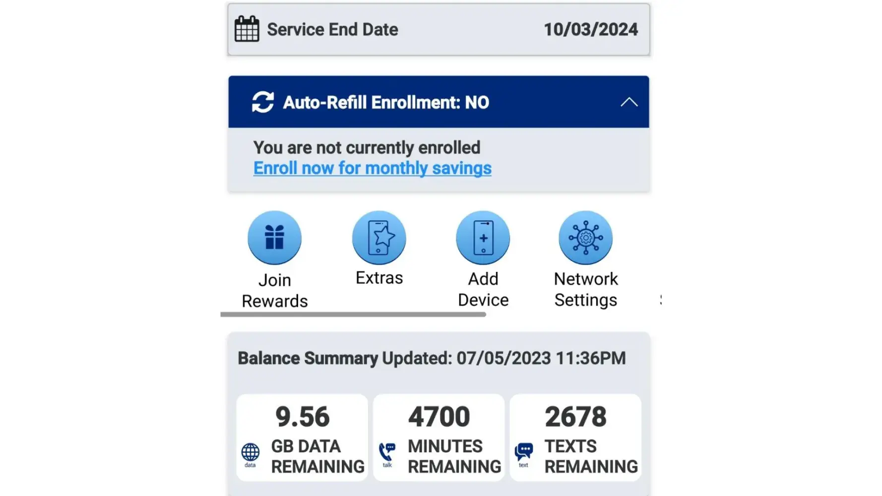 On July 4, 2023, I purchased a one-year Tracfone Card on ebay, as I have done many times. The card topped off my existing balances to 9.56 GB of Data, 4700 Minutes of Phone, and 2678 Texts, with a Service End Date of 10-3-24.