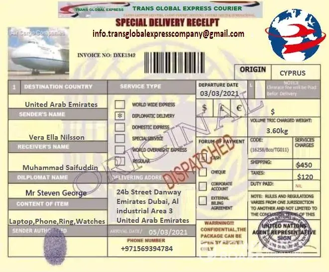 I hereby inform you of a pending delivery originating from middle east afghanistan which is now in our office here in turkey.