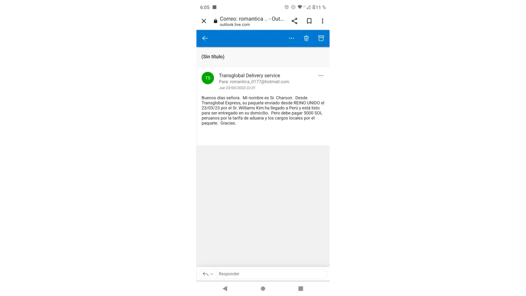 Buenas tardes soy Miriam jaramillo del Perú querÃa saber si el mensaje que adjunto a la presente fue enviado por su empresa porque en el correo que envÃan toma. El nombre de la empresa global express dónde me indican que se me ha enviado un paquete con fecha 23/03,/2023 origen Reino Unido de parte Williams kim con destino a mi dirección en Perú y me solicitan que para la entrega a mi domicilio del paquete debo de realizar el pago de 5000 nuevos soles como Tarifa local espero su pronta respuesta