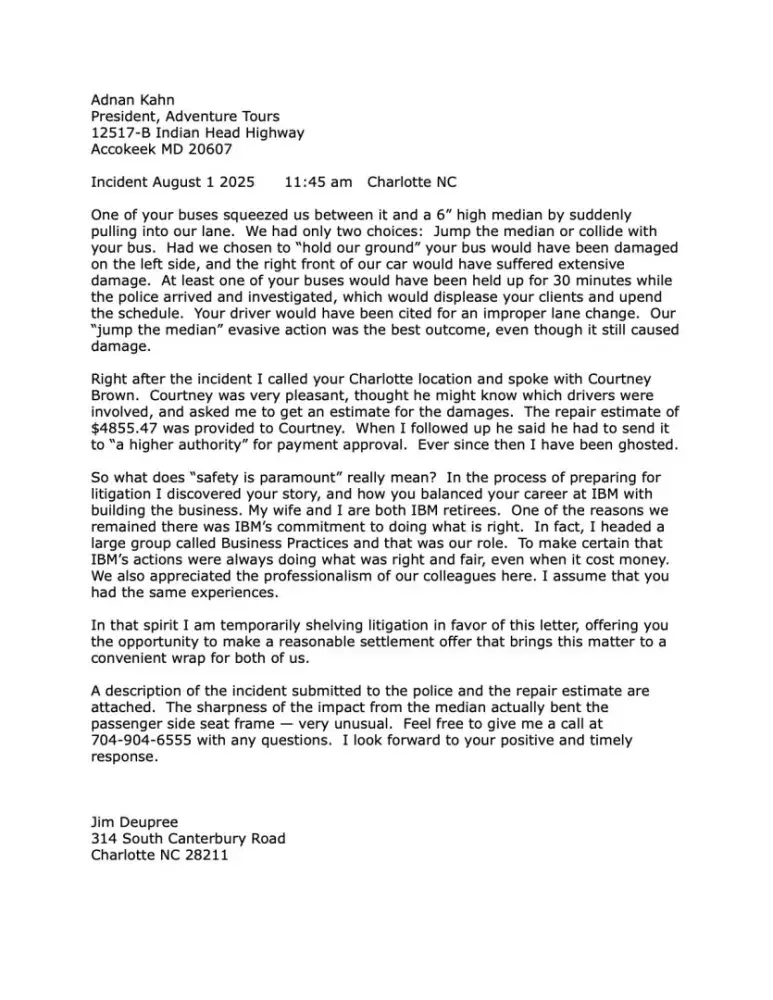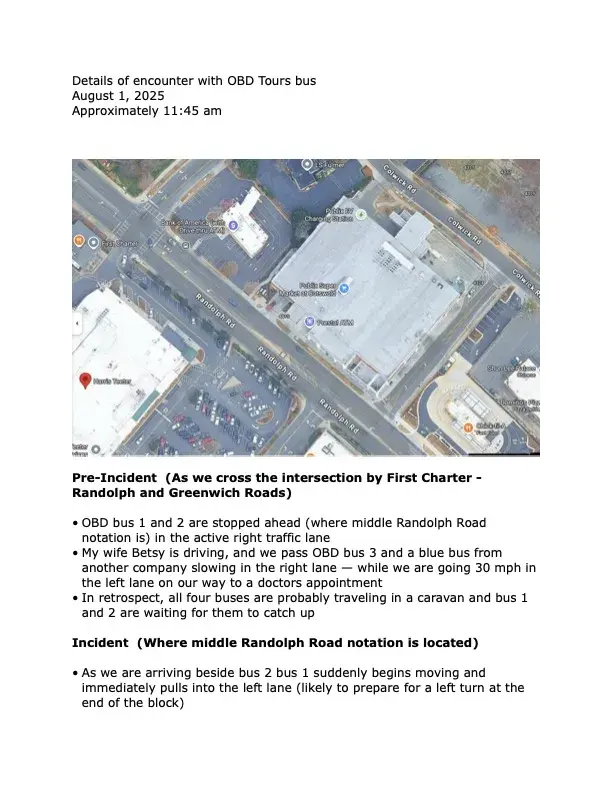 The lead bus in their convoy was stopped improperly in the active right hand lane. Then it suddenly began moving forward and sharply cut into our lane. On our left was a 6" high median. We were forced to make an instant decision -- get hit by the bus, or take evasive action by driving over the median. We chose to drive over the median, which caused $4700...