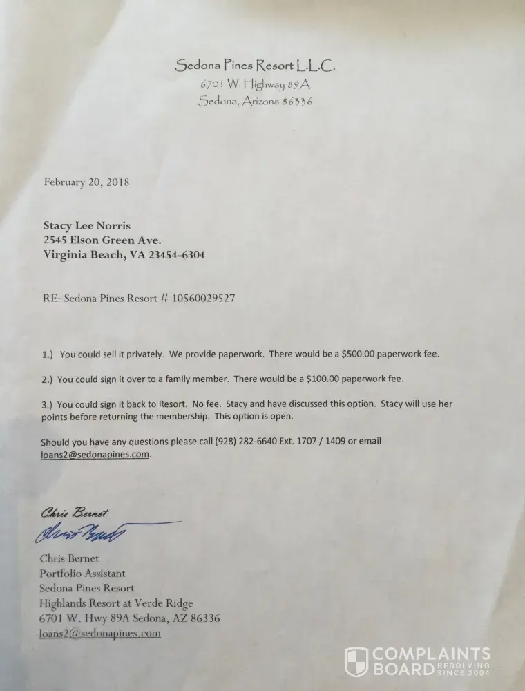 In 2018 I was given a written statement confirming an option to sign my membership over to the company without cost to me. The offer specially says "This option is open.". In 2020 I tried to exercise this option and was told that the company (Sedona Pines LLC) had been bought by another company and that the new owner was not honoring those agreements. On...