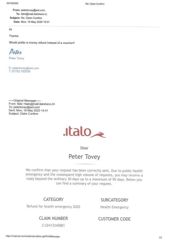 Read full complaintItalo - Nuovo Trasporto Viaggiatori S.p.A - Refund