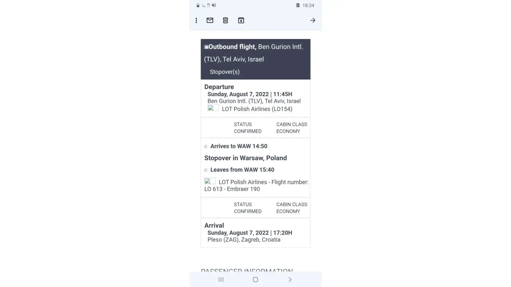 I booked a flight from Tel-Aviv to Zagreb via Warsaw for August 7 2022. Booking reference [protected]. Booking code 3F9XWF. (Attched is a photo of the original booking confirmation(