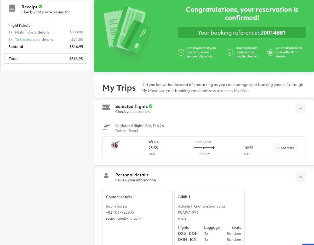 I have booked flight for my friend on 26-02-2022 from Dubai to Seoul in travelgenio website. I paid $816.95 for the ticket. The amount has been deducted from my card. But when I checked in Qatar airlines webpage, the given ticket number does not exist. I want to get the money back so I searched internet and found an email ID which they have given in their page but the mail was not delivered. The mail ID they mentioned is [protected]@travelgenio.us. After these I found through the internet the agency itself a fraud company. Lots of peoples were doomed by them. The booking reference they provided is [protected].