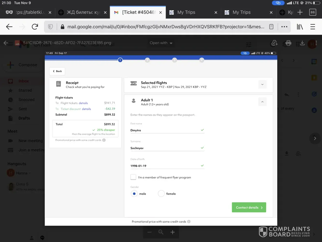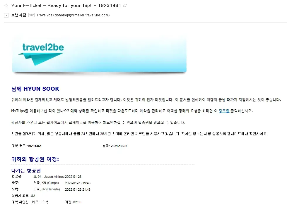I purchased a ticket on the website Travel2be (aka Travelgenio): booking number [protected]. My account was registered under the email [protected]@naver.com. The company sent me the e-ticket to this email address on 8 October 2021 (see attached screen shot).