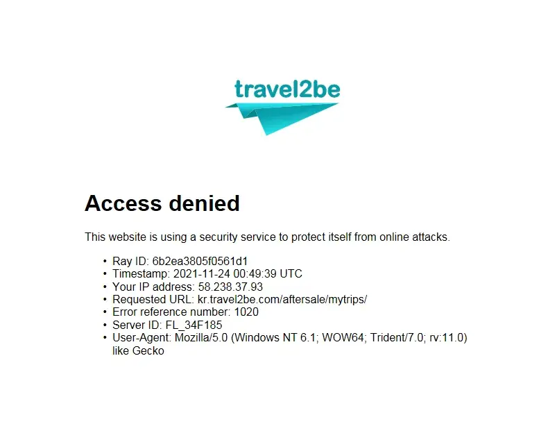 However, when I tried to access the customer service page on the Travel2be website, the page is blocked (see attached screen shot).