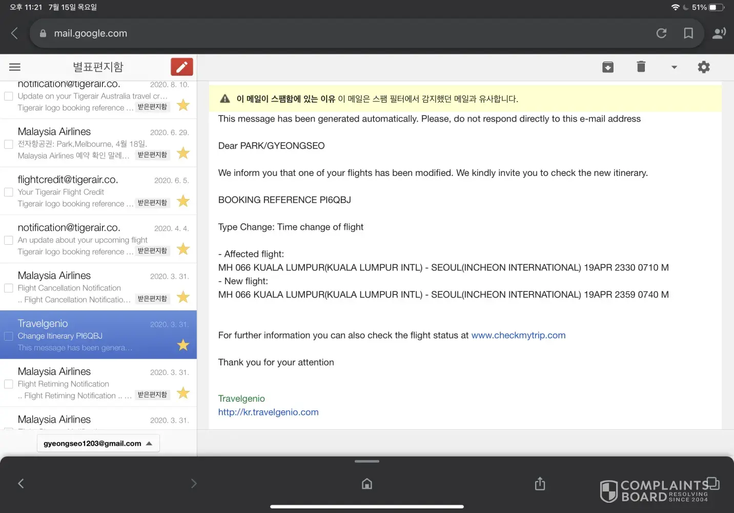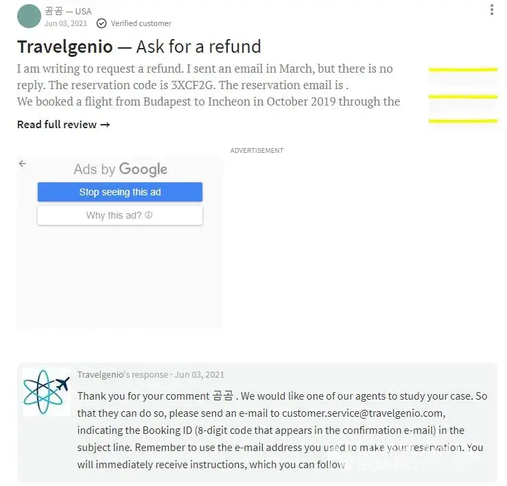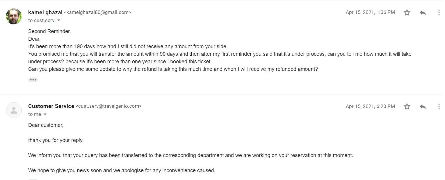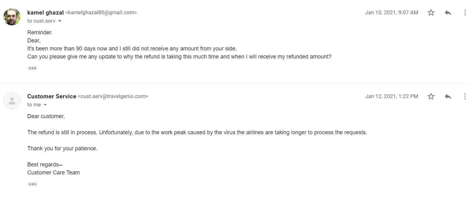I contacted Travelgenio October 2020, November 2020 and February 2021 and received the same response each time.