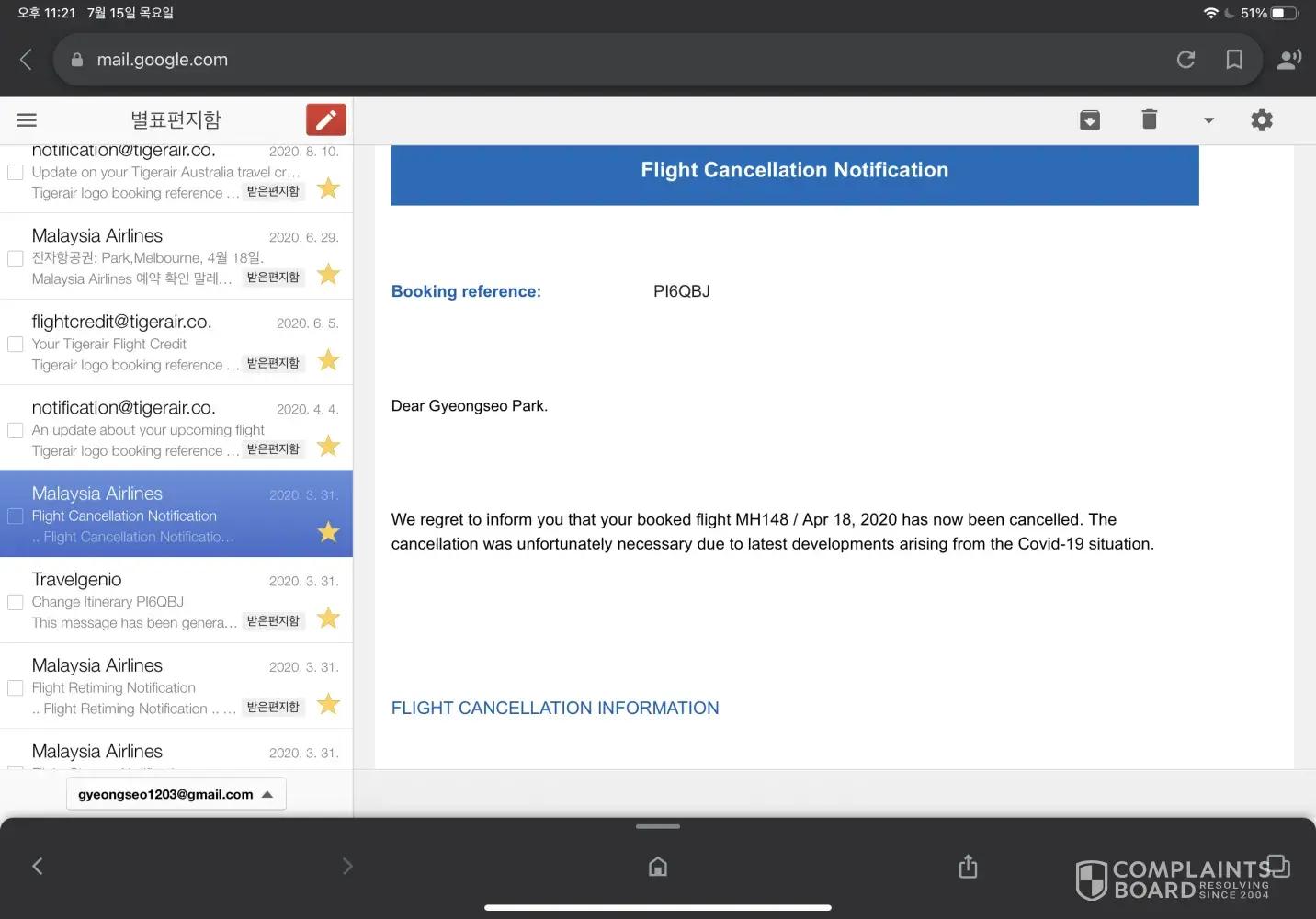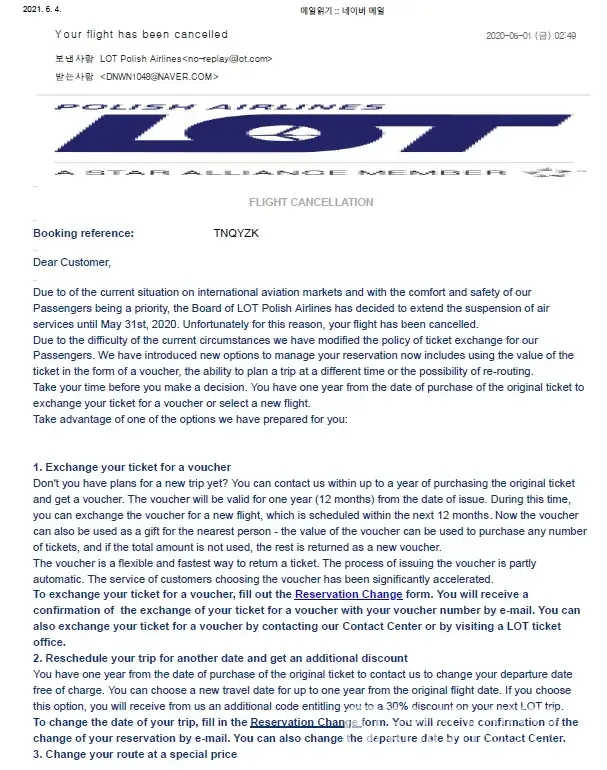 The flight was continuously changed due to corona, but it was canceled. It's already been more than a year, but I haven't received a refund yet. There is no reply to the email and no reply to Facebook messages.