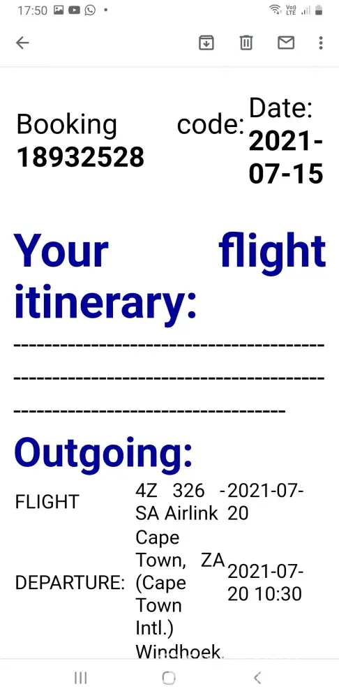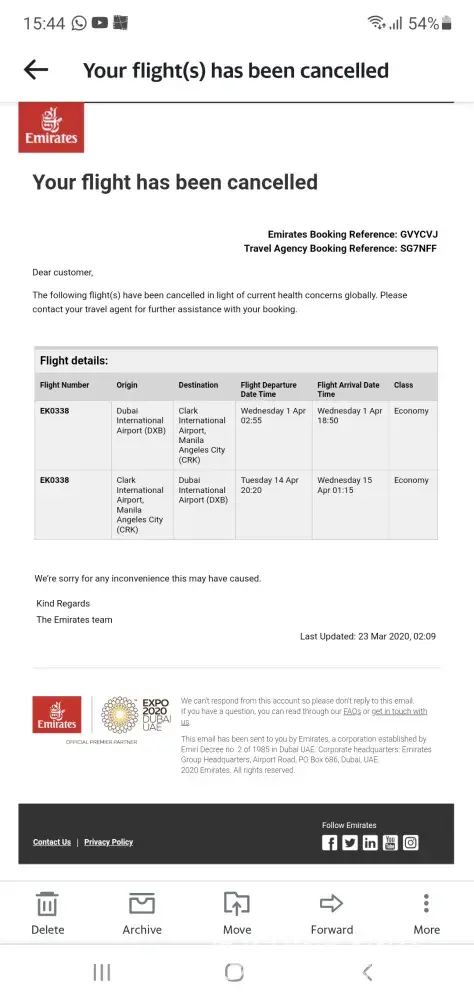Cancelled Flight EK 0338, booking reference number SG7NFF