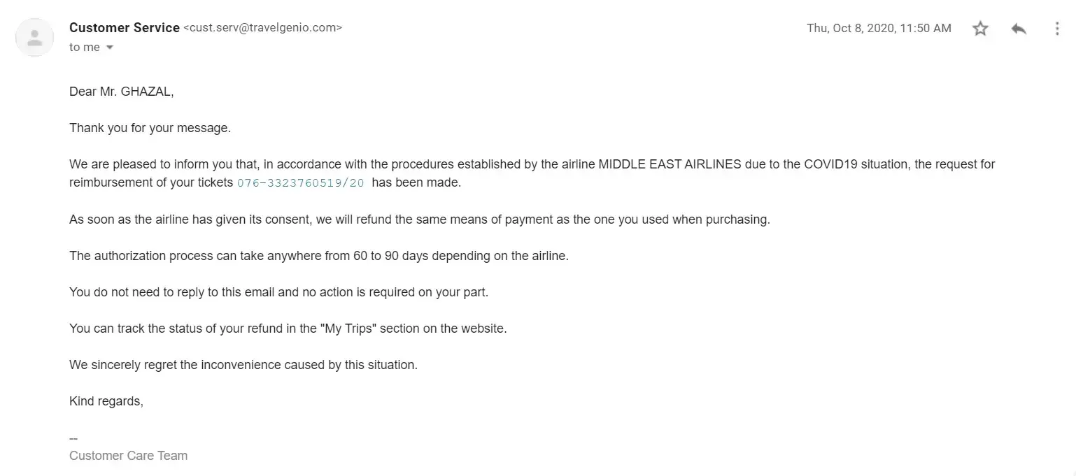 I send an E-mail to Travelgenio to refund the return flight amount in September 2020, they replied to my mail saying that the request for reimbursement of my tickets has been made and when the airline will give its consent they will refund the amount and The process will take from 60 to 90 days.