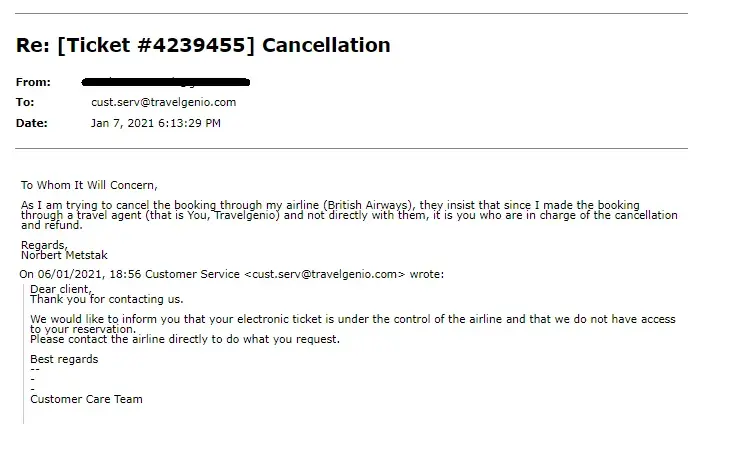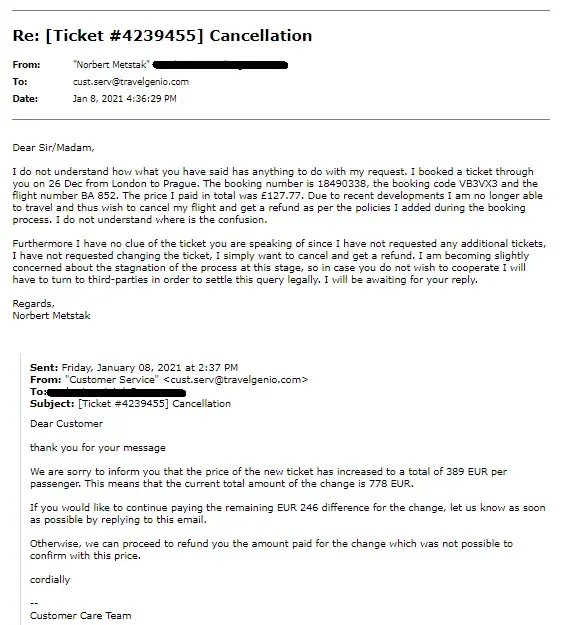 We were scheduled to go to Malta, Europe on a holiday back in June 2020 and due to the restrictions due to the Covert virus our flights were cancelled, We were to depart from Manila, Philippines to Malta. As soon as I was notified by Travelgenio that our flights were cancelled, I requested to get a refund on the airfares and that was in June 2020. For the past 4 months, I have been sending the Travel agency ( Travelgenio ) several e-mails to check on the airfares refund and not a single reply received from them. I ran out of other options to contact Travelgenio because I also sent a register mail to the corporate office and also called and still did not hear from anyone.