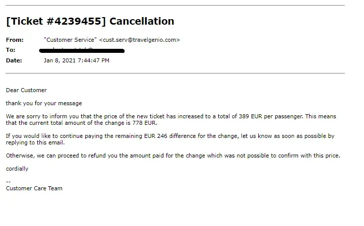 On March 24, 2020, I have received an email from Travelgenio about cancellation and refund of COVID-19-related tickets.