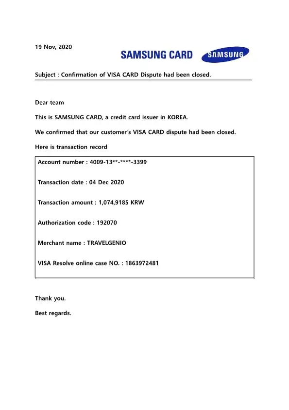 In order to proceed we kindly ask you to provide an official statement signed and stamped by your bank informing about the closure of this matter to process the reimbursement into the same payment method used during the booking process.