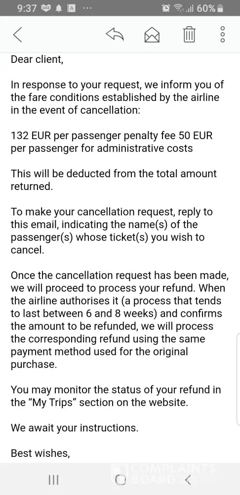 They told me that the flight wasn't cancelled by the airline so I have to penalty by the airline of 140euros and 50euros as cancellation feee.