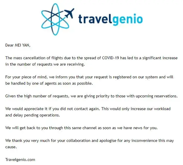 I am fully understand on my flight cancellation due to COVIS19. I was informed from Travelgenio that my flight cancelled due to COVI19 around beginning of March, 2020.