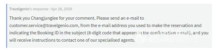 Thank you Changjunglee for your comment. Please send an e-mail to customer. [protected]@travelgenio.com, from the e-mail address you used to make the reservation and indicating the Booking ID in the subject (8-digit code that appears in the confirmation e-mail), and you will receive instructions to contact one of our specialised agents.