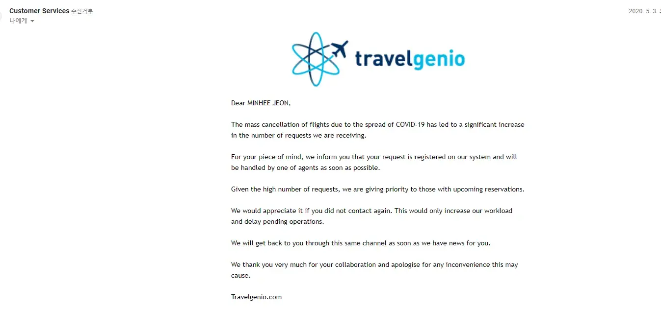 Our flights were supposed to be 3 months ago and I have been emailing and calling both travelgenio and the airlines. Each is passing the responsibility to the other and in the last email over a month and a half ago the email from travelgenios customer service asked me not to contact them again as they are busy and they will just message me. 3 months, no flights, no refunds. I have been more than understanding due to the Covid-19 but this is ridiculous, we are entitled to a refund by law if we cannot travel due to the world pandemic. When this is over and it will be, I highly doubt many people will use travelgenio for booking anything else. It's disappointing and embarrassing that everyone has to chase for their own money back on a service they have not received.