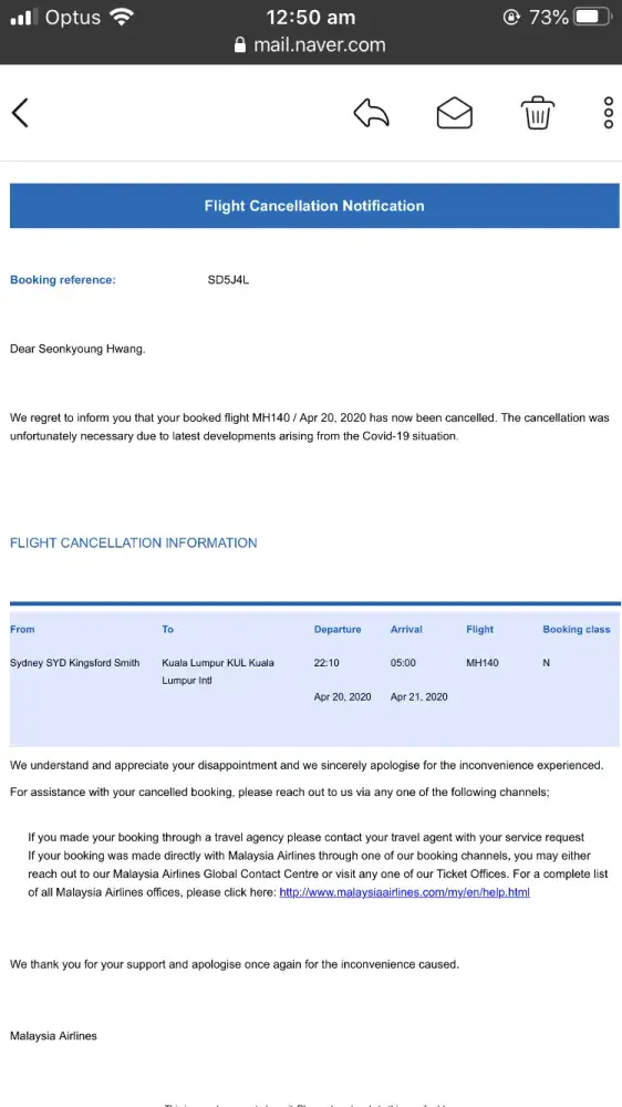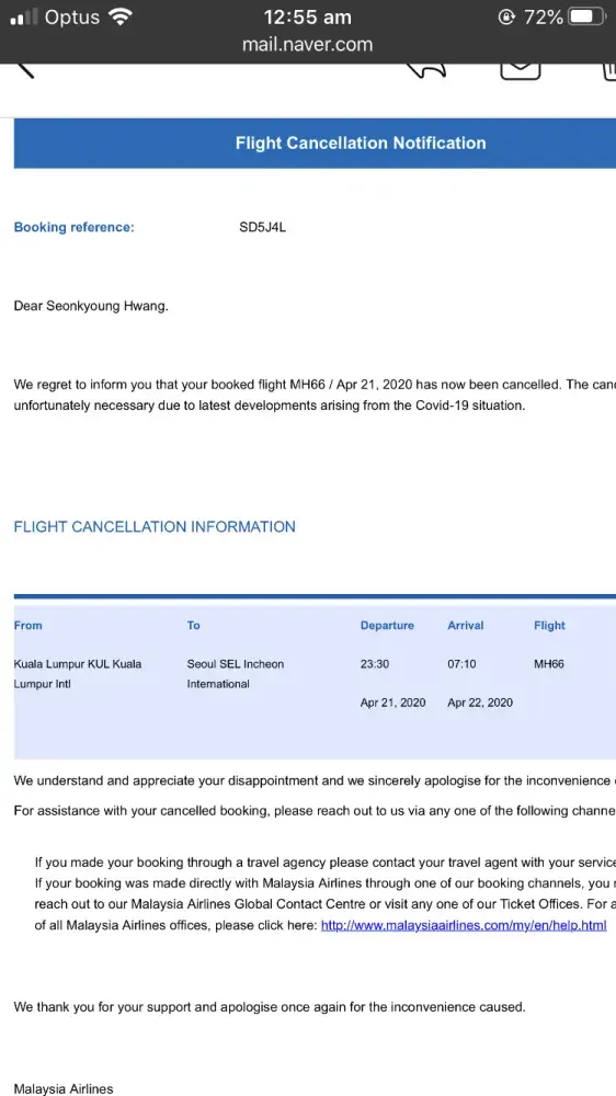 Hello [protected] this is my flight code. I got cancelled my flight because corona virus. But I have to try other flight ticket what I go back to my country. But I still didn't refund. I don't have money anymore. I need to refund all. Please answer to me. [protected]@naver.com