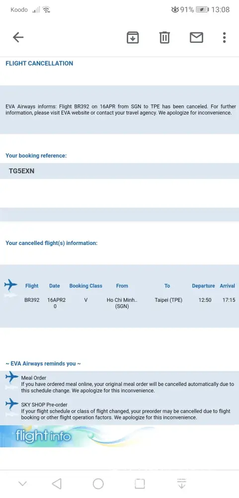 Hello, my name is Hien Do and I bought 2 tickets SGN-TPE, TPE-YYZ. However, I found the flight SGN-TPE will be operated by Eva Air had canceled due to COVID-19. Because of this circumstance, I would like you to full refund my ticket as soon as possible. My booking code are TG5EXN and MEJDD4 . please confirm my request and reply. Thank you.