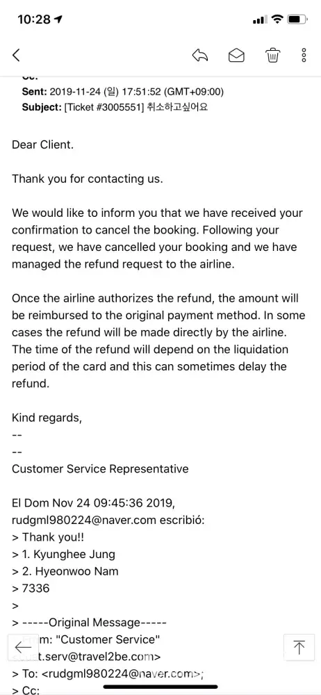 Afterwards, the trip was canceled due to the corona situation, so we requested to cancel the flight ticket, but the 3 emails did not respond to it, so it was not processed.