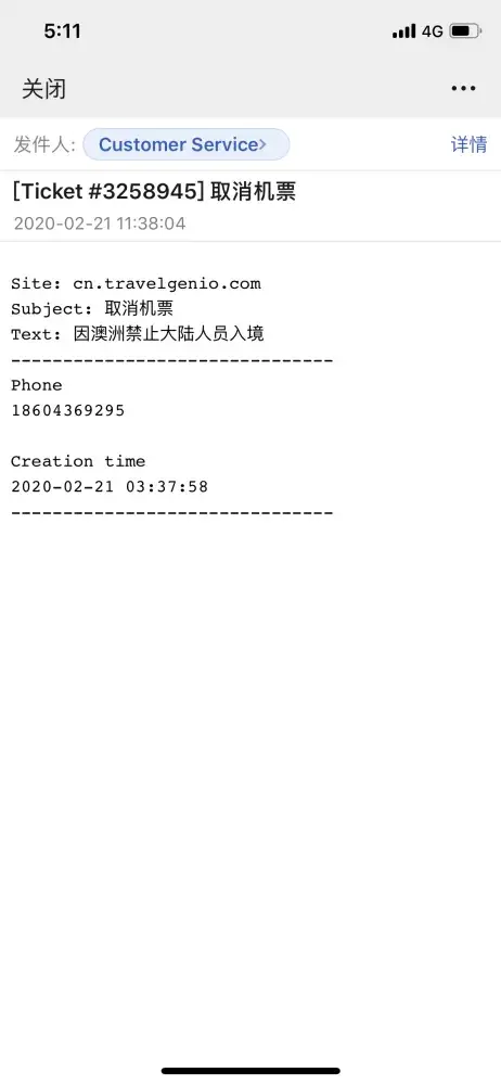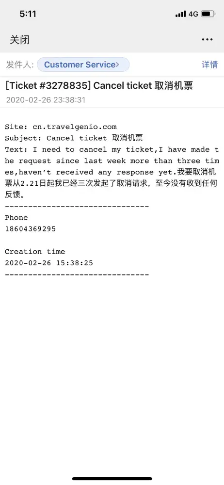 I have booked the flight from China to Australia through Travelgenio.Due to the Coronavirus Australia restrictions I need to cancel my tickets. I tried to contact Travelgenio since last Friday, through their website customer service page. I made the cancel request more than three times, but no one has ever replied to my request in one week.I tried to email urgent@travelgenio.com and customer.service@travelgenio.com still no response.And no one picked up the phone.How can I solve my problem?The flight date is March 1st. I have to cancel it now.Who can help me here?My email address is [protected]@qq.com help me now!