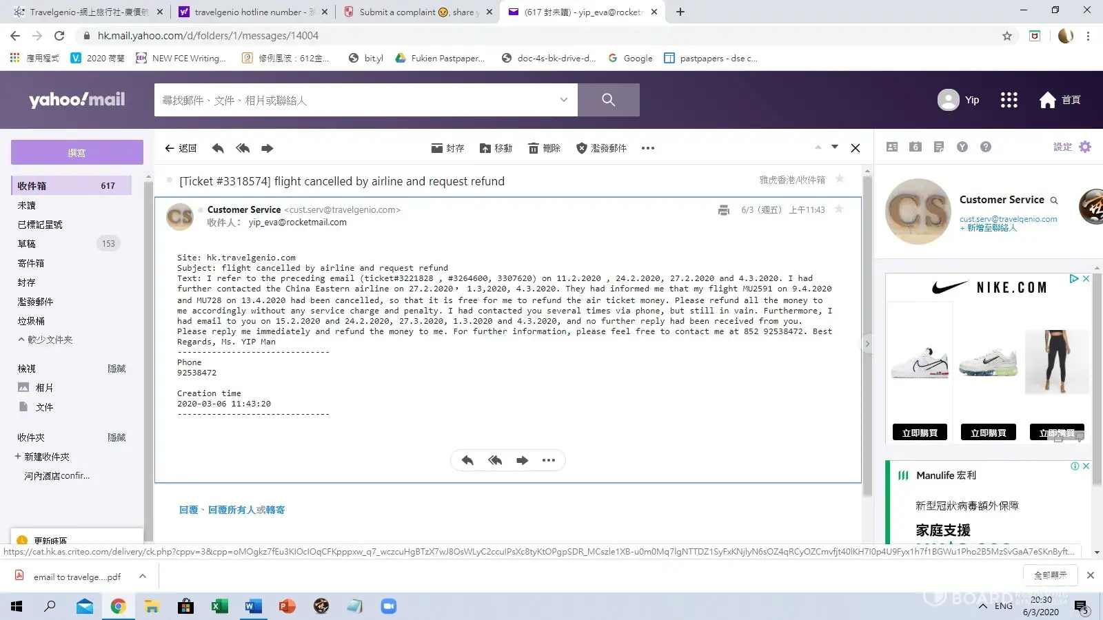 I had contacted you several times via phone, but still in vain. Furthermore, I had email to your customer service section on 15.2.2020 and 24.2.2020, 27.3.2020, 1.3.2020 and 4.3.2020, and no further reply had been received from you.
