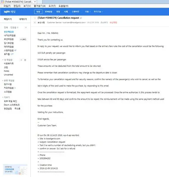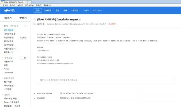 I made a request to cancel my ticket by email.( 2019.12.09)