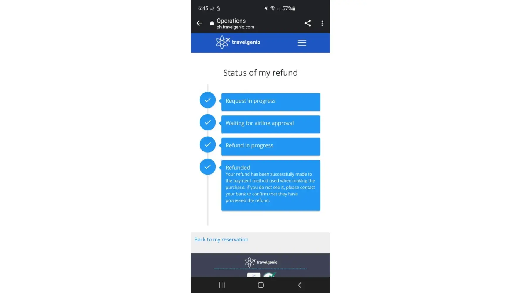 When I booked my tickets for the flight the travelgenio suddenly canceled it and when I saw my refund status it said it was fully refunded but it was never reflected in my bank account. I bought the tickets on Oct 2, 2022. My booking reference is [protected]. We booked a round trip from manila going to japan for 4 people and I never received a full refund in my bank account.
