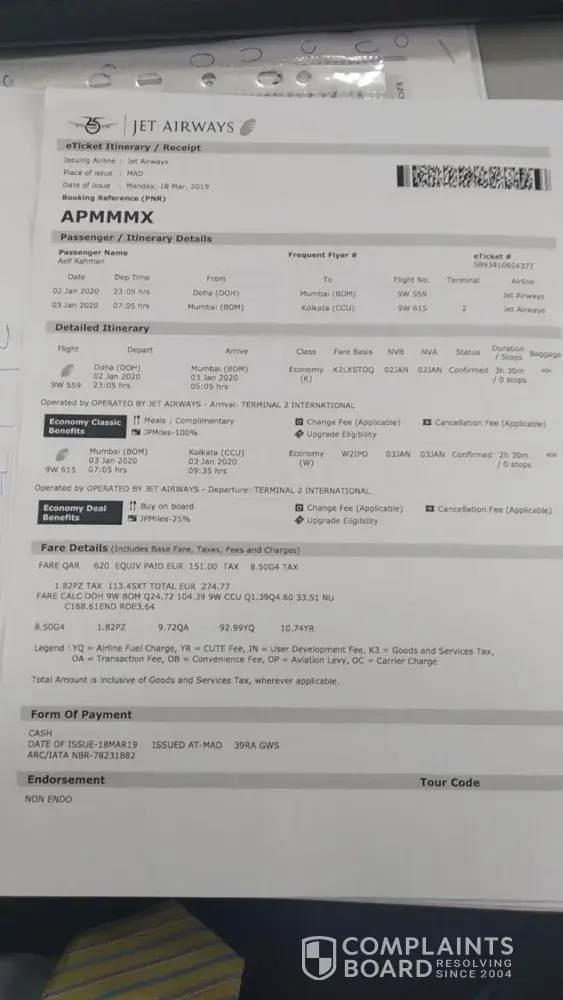 [Ticket #2445374] Booking 8DTJ5G and 8SFPKA // Jet Airways