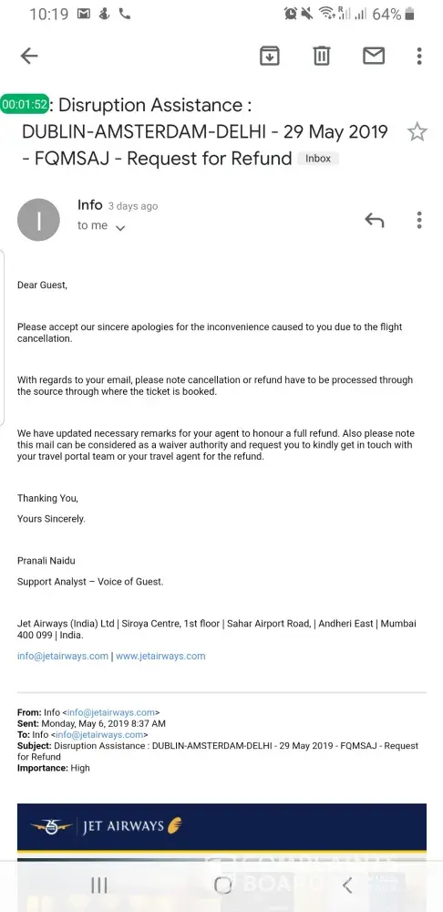 Flight booked was Jet Airways. Since Jet Airways has been shut down in April 2019, we ask for refund of booking.