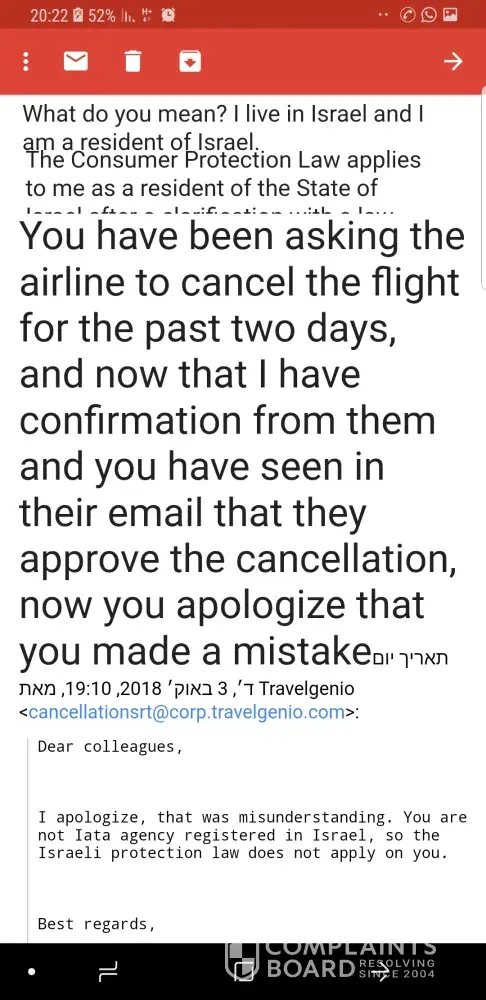 I have been trying for 8 hours to resolve this issue. I called the airline to add excess baggage to my flights which are in 3 days. They informed me I had no ticket as Travelgenio had not paid them. I was offered a refund by Travelgenio to which I said no I just wanted the flights. After such a long process of back and forth from which the airline called Travelgenio directly, they said they were no longer offering a refund and I have to wait for their response. I want to cancel and I will book the same flights myself, as the staff at Travelgenio are extremely unhelpful and were rude to both myself and my mother. The airline can also not guaruntee the flighst will still be available by the time I get a response and I do not wish to risk this as I have already booked domestic flights to get to Athens airport. I just want a refund so that I can ensure I actually get on the plane, seeing as it was the fault of Travelgenio that I do not have a confirmed ticket. I paid for the flights almost a week ago and assumed them to be confirmed, as per my confirmation email, however this was a lie.