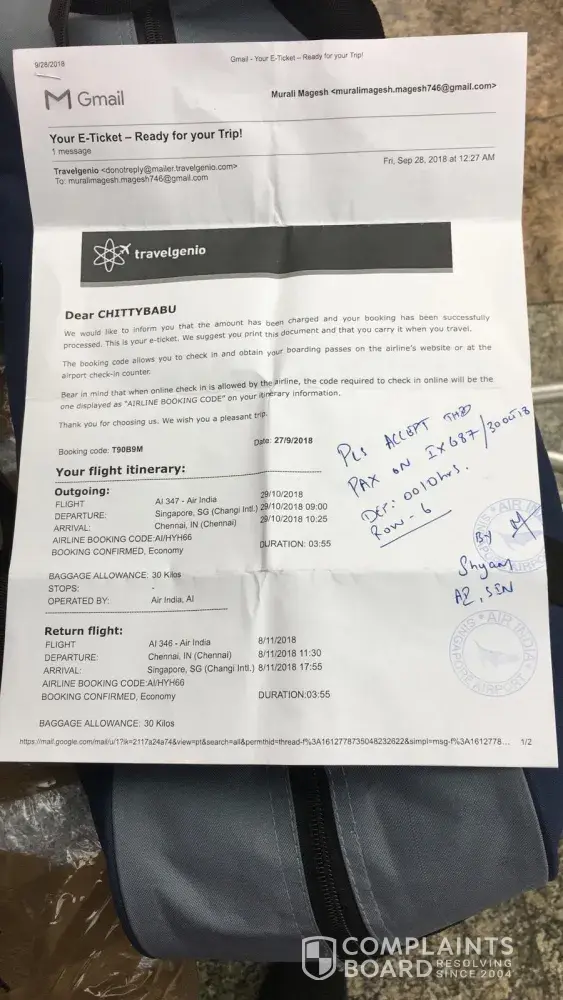 Murali here, I have booked flight from Singapore to Chennai through your agency online, I suppose to travel morning 9 am from changi airport by air India flight to Chennai but when I have reached airport came to know that flight time has been rescheduled and that information I haven't receive through message or any email and I approach airport information service counter( air India ), they clearly explained that it's not the fault from air India because the ticket has been bought through travelgenio and contact information was them including contact number, so agency responsibility to inform me ...