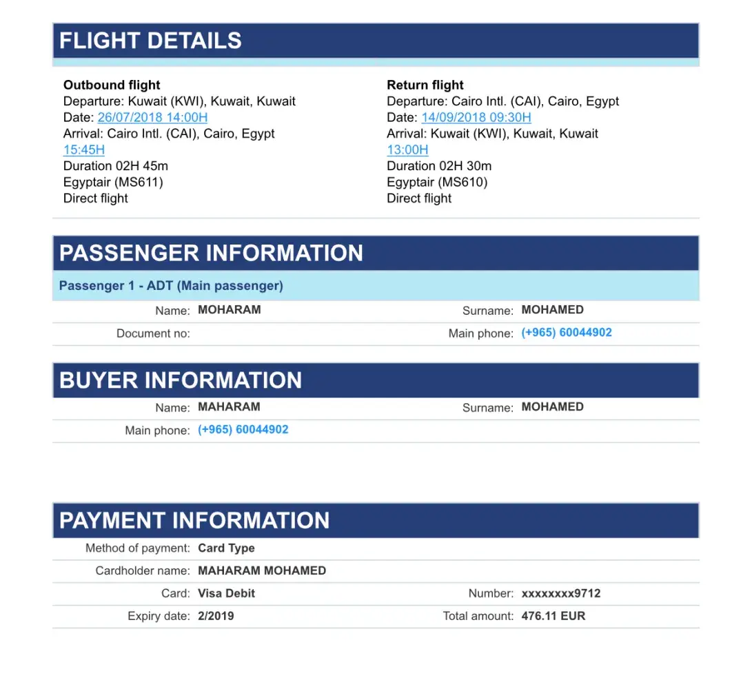 I made the reservation through your website and I booked the ticket from kuwait to Cairo and return trip from Cairo to kuwait and the total amount of the charges should be 476.11 euro and it is dedicated from my bank account 556.90 euro
