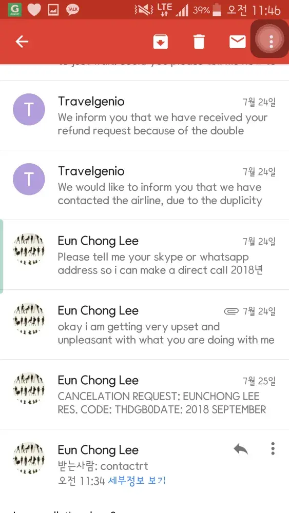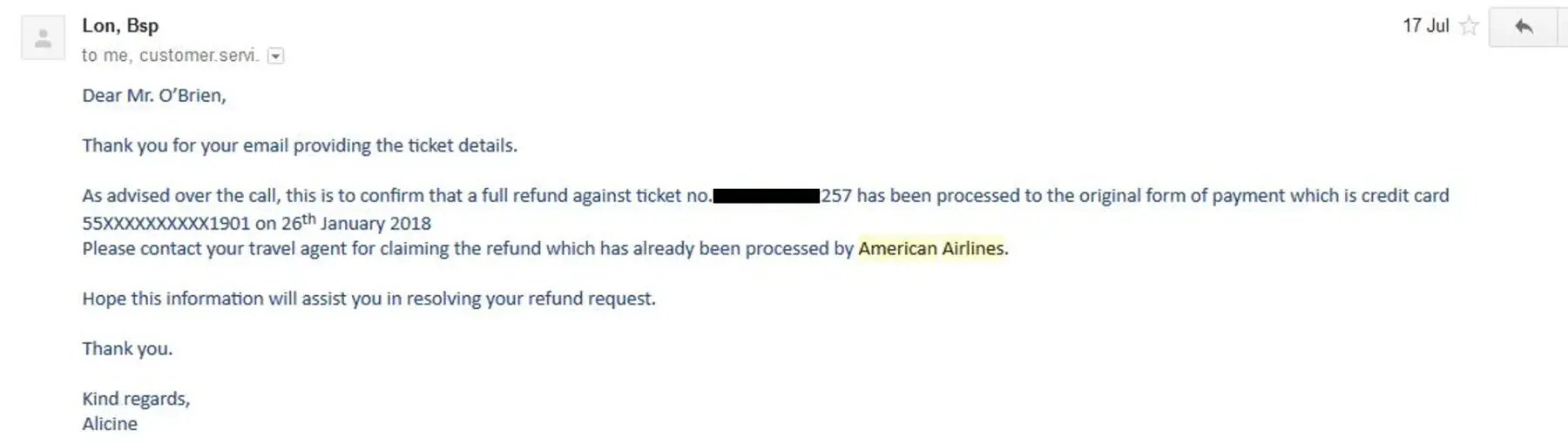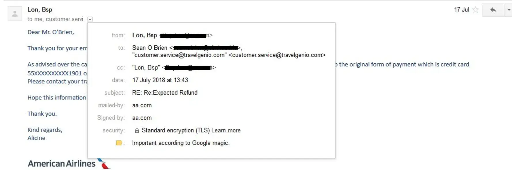 One of the attachments below shows the email from AA sending the money back to TravelGenio (Mastercard ending 1901) and the others show AA and myself contacting Travelgenio with the evidence.