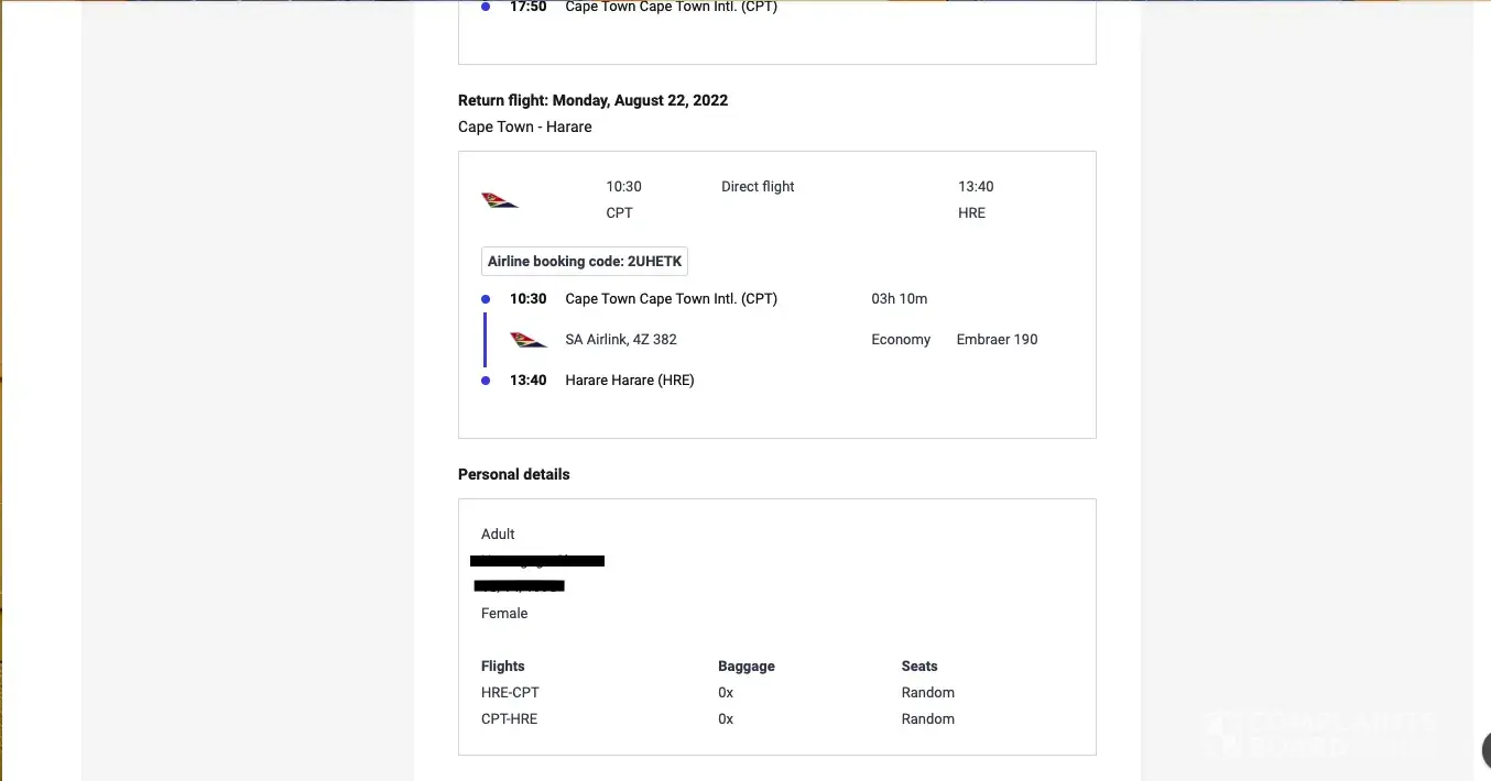 Mine is not a complaint but I cannot seem to find any other platform to contact you. I booked a return flight from Harare to Johannesburg yesterday. I paid using a VISA card and will be traveling with my son. My employer requires an invoice/receipt for them to be able to reimburse me. I am kindly requesting this please. There is nowhere for me to place my contact details privately so wondering how best you can reach me