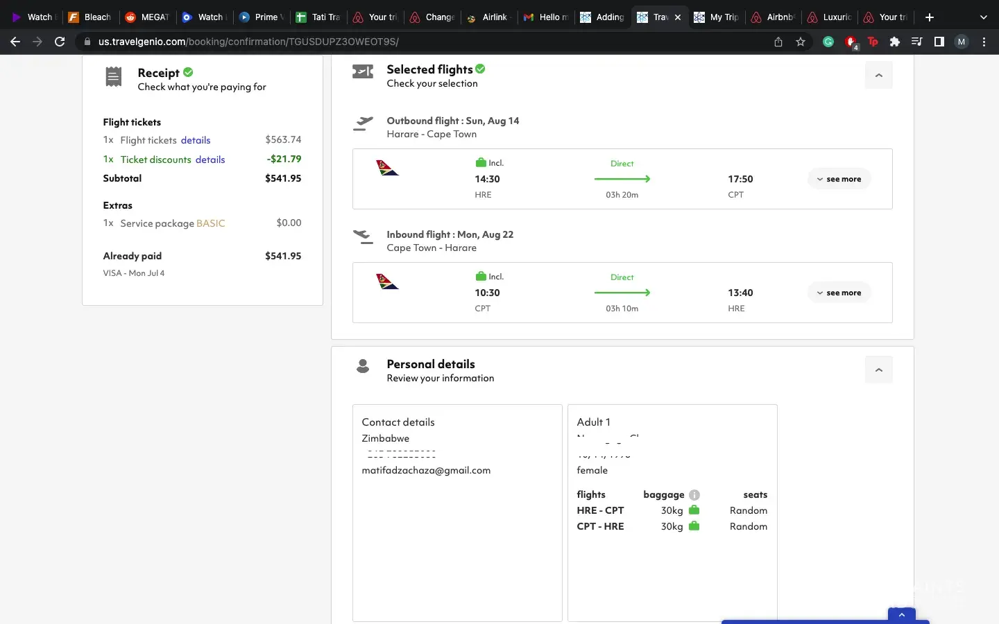 My reference number is [protected]. I booked a $540 round ticket from CPT-HRE with your agency yesterday (July 4) with 1x30kg bag confirmed for each flight in the receipt, but the confirmation says there are no bags included. I also have not yet received my ticket. When I try and input the airline reference number on the airline’s site, they say there is a booking but they cannot assist me with any further information.