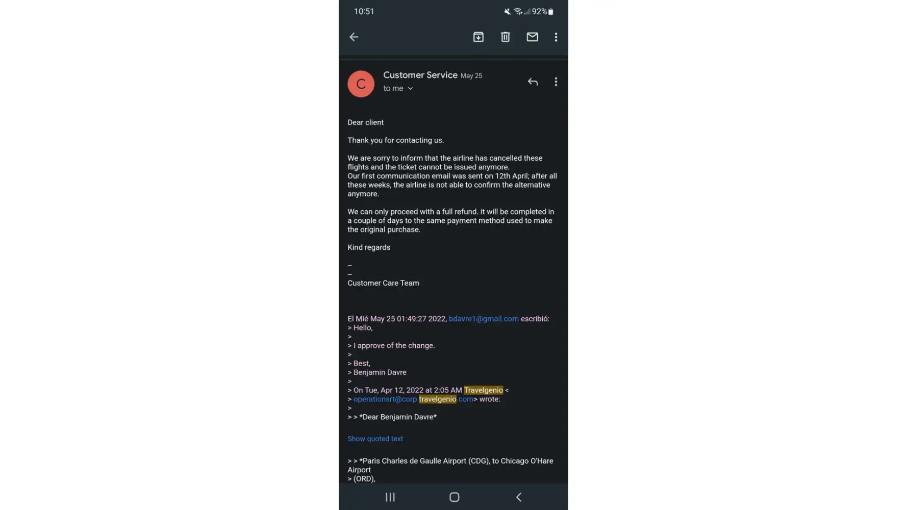 I requested a full refund from Travelgenio for a flight Dublin to Chicago with return in May 2020. Flight was cancelled by American Airlines and American Airlines proccesed a full refund to Travelgenio on 5th of May 2020.