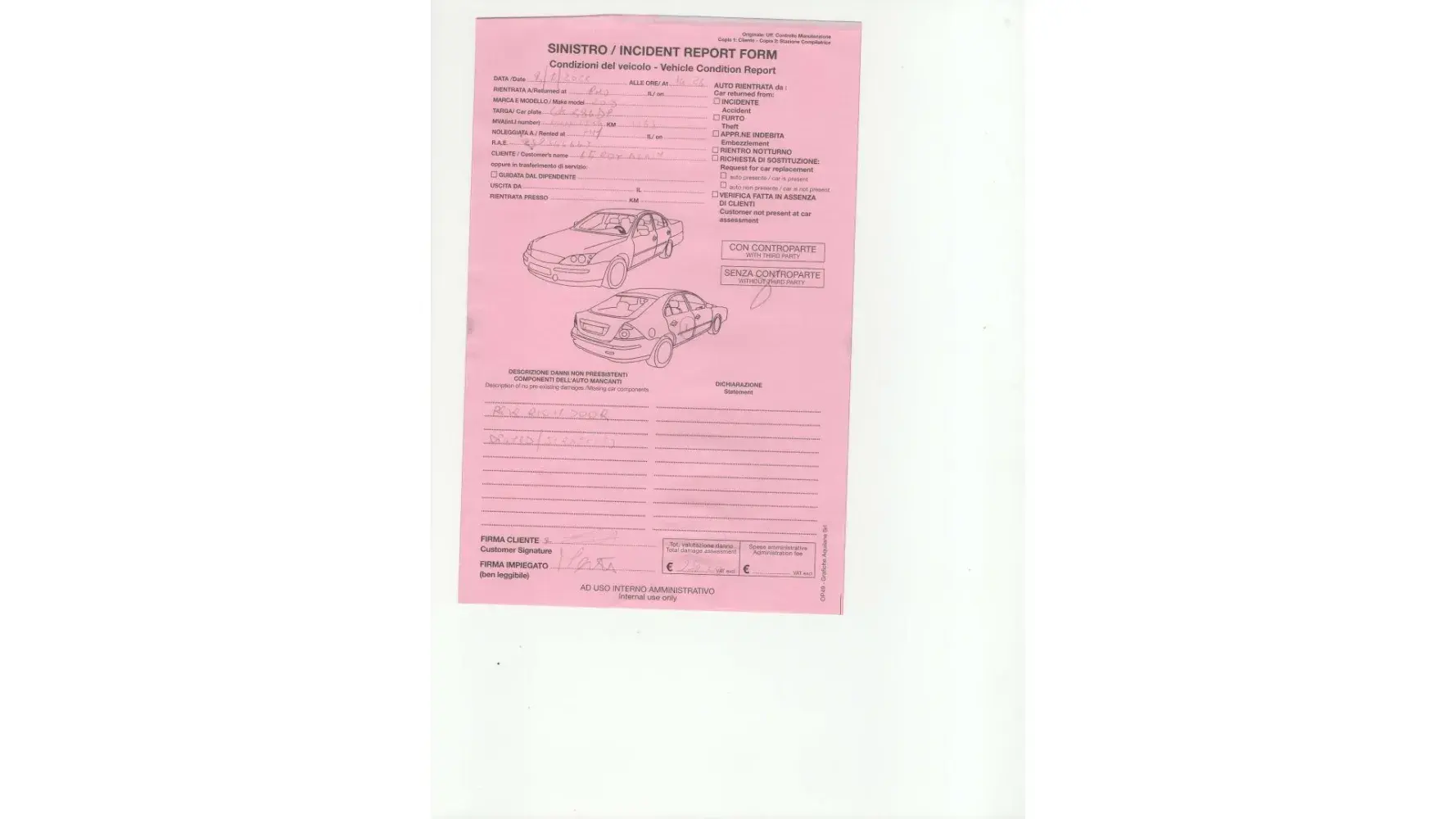 Attached photos via link, https://photos.app.goo.gl/LWZ4muqYjQm4hUgL7, on "my" car damage (the red car) and third party damage (the white car) and a couple of documents from Centauro that I received when I returned the car.
