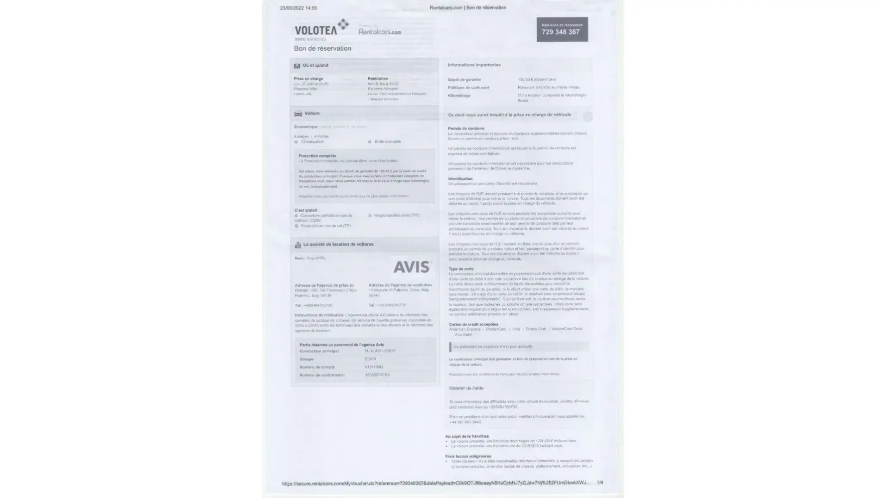 J'ai souscrit une assurance Protection Complète pour une location de voiture chez Avis Palerme. N° de la réservation : [protected] en date du 23 juin 2022.