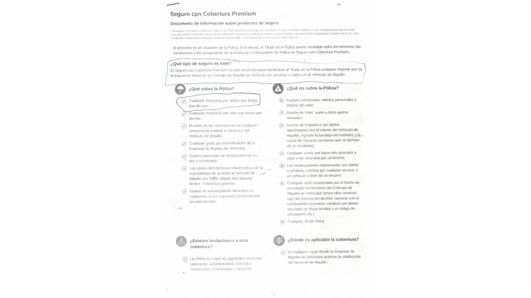 Being signed our assurance at EUROPCAR BARCELONA in YOUR COMPANY, RESERVATION: [protected] (Document-1), with coverage (indicated on the assurance certficate) "this assurance PREMIUM will reemborse anmy import fopr loosings and damages in your hired car INCLUDING ANY FRANCHISE YOU MUST SETTLE" (Documents-2/3).