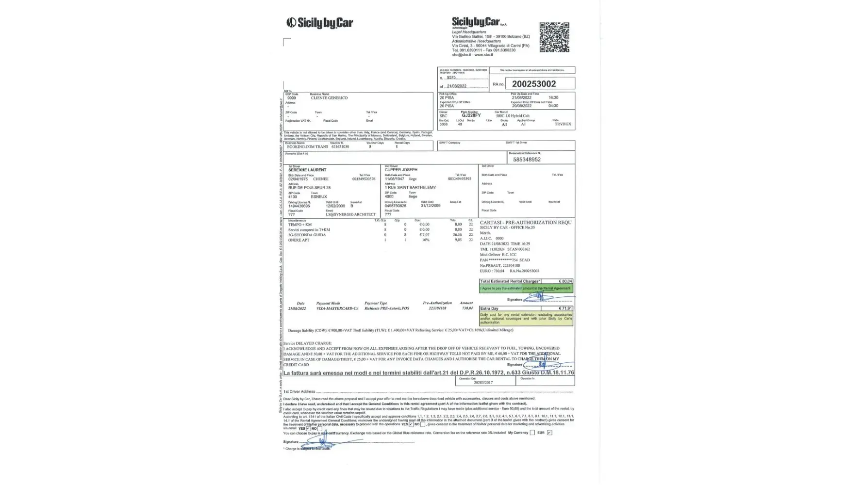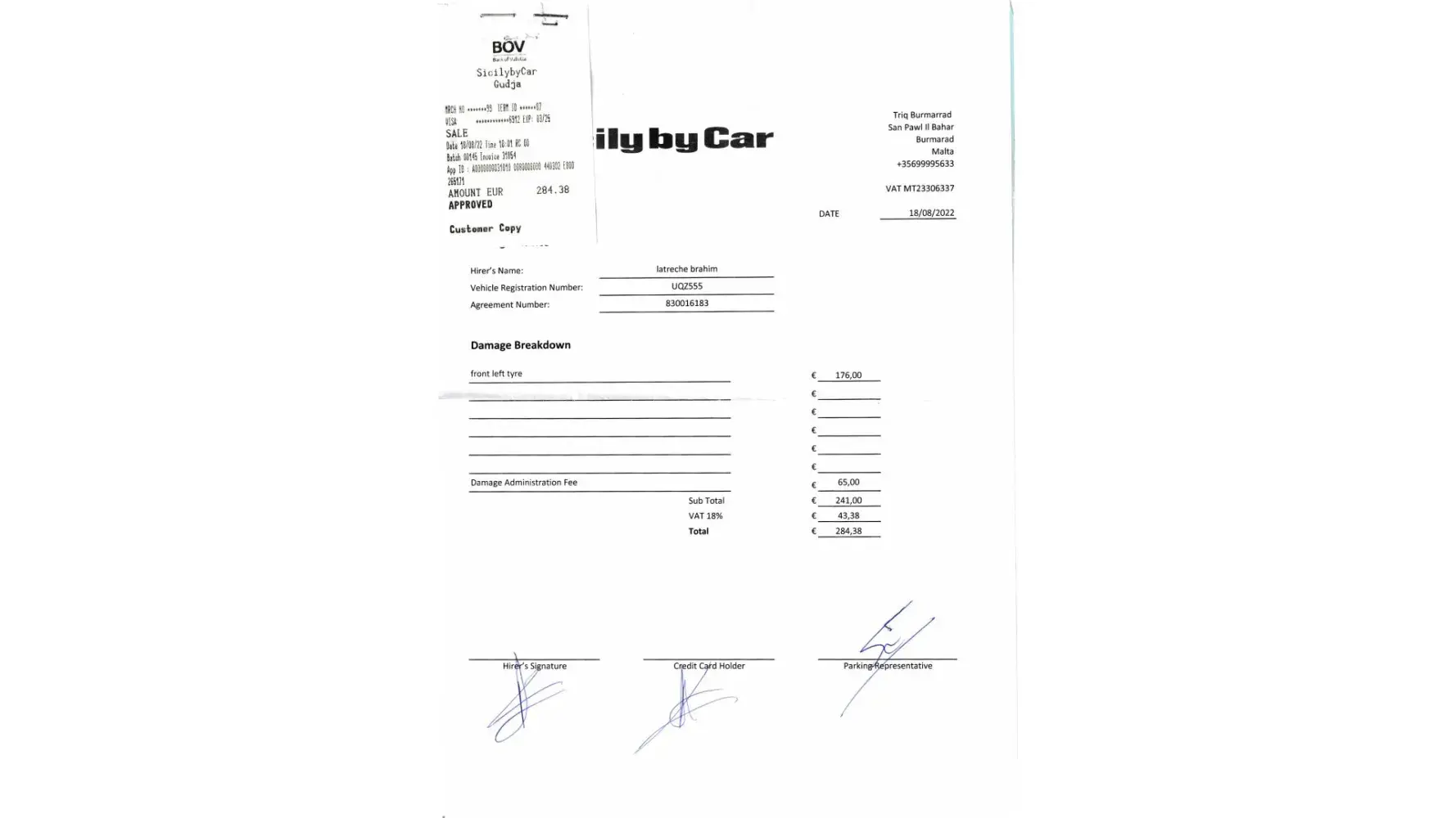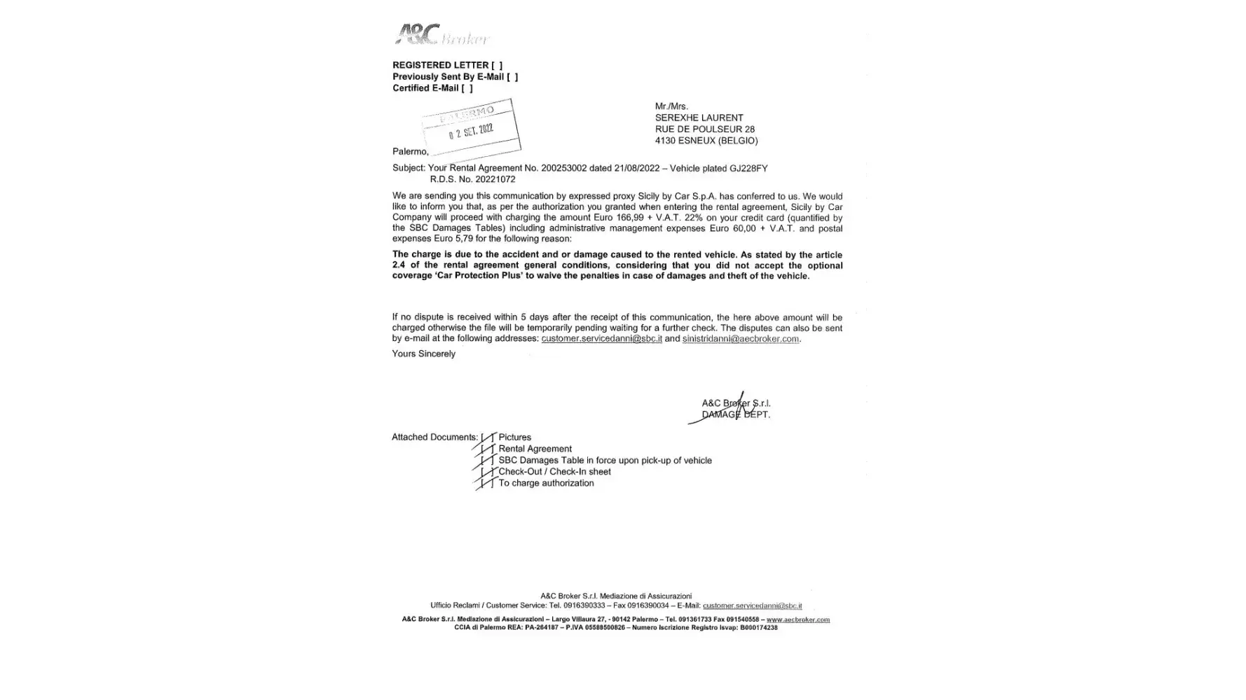 You will find attached the letter from the rental company Sicily By Car (see attachment "Sicily 1 to 6.jpeg").