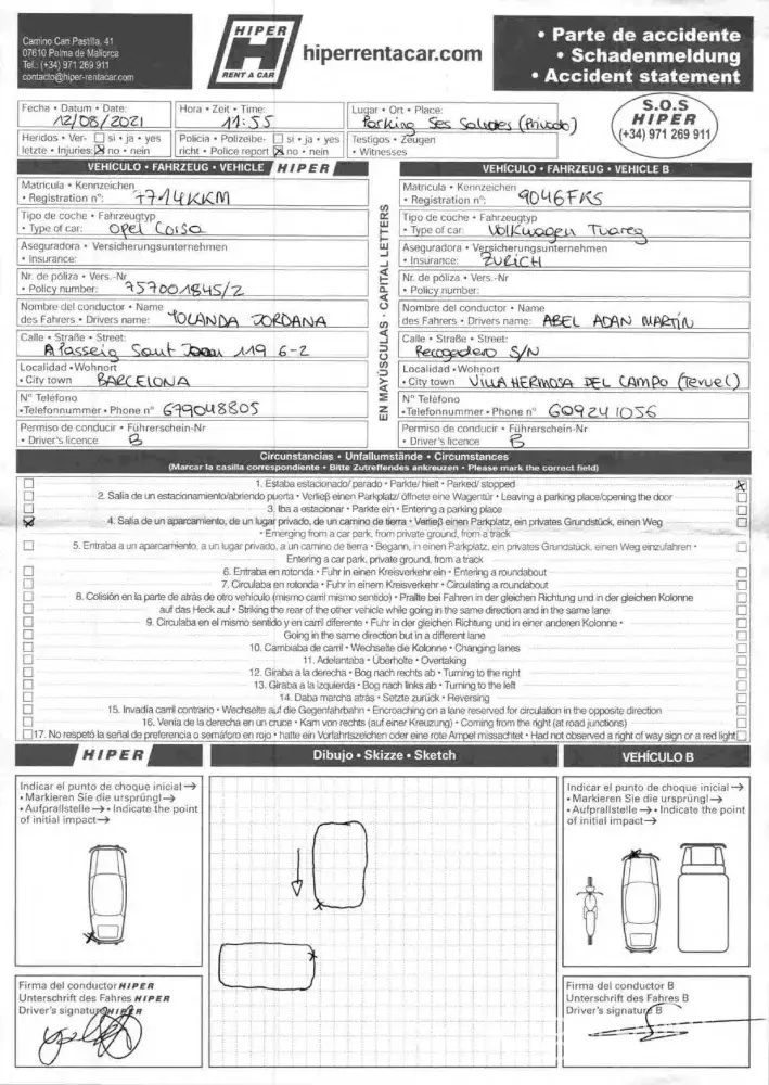 -Del coche de alquiler se dañó la parte trasera a la izquierda y del otro coche la parte izquierda delantera.