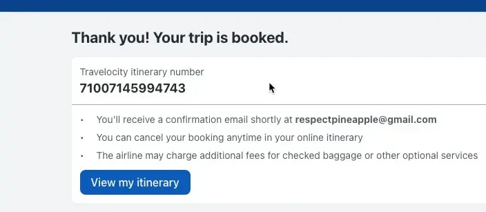 In my browser, I saw a message reading "Thank you! Your trip is booked.l Travelocity itinerary number [protected]. You'll receive a confirmation email shortly at [protected]@gmail.com."
