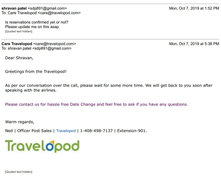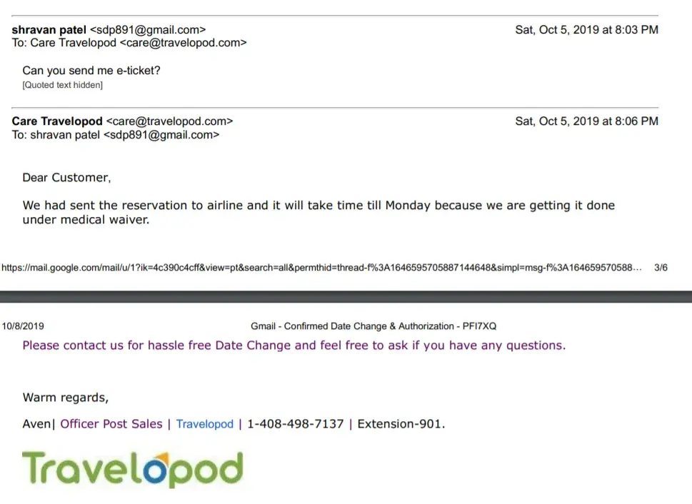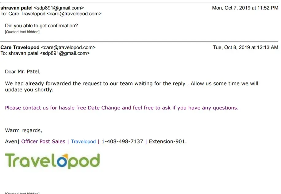 I had two tickets reserved for Nov 18th 2019. However, due to medical emergency passengers needs to travel asap. I have been contacting travelopod concern department to make changes of date. Every different agent is giving different dates within a week time period without providing any conformation. Now They want us to travel on Oct 10th 2019, it is Oct 9th in India. How can they travel internationally within 24 hours without having confirmed tickets. Every single agent telling us different story, basically all of them are lying. Every time I call them, they are giving me two hours of time for conformation since 5 days. You need to hire professional people. It's seems like business is operating from house. I need to resolve this issue asap on top priority.