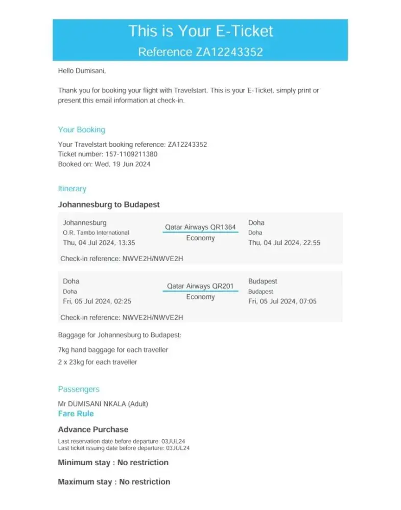 I booked a flight for my daughter to South Korea, she was due to start work on Monday 22nd May 2023 so we decided that she should fly on Friday 19th May so that she could reach South Korea by Saturday evening and get rid of the jet lag on Sunday by resting and getting ready for her work on Monday. But this was not the case. Travelstart messed up her flights and instead of landing 2 hours earlier to board an international flight, they gave her 10 mins to run from domestics to international and by that time her bags were already offloaded from the plane and the doors were closed on her. I had to reschedule her flights for Saturday 20th May 2023 causing a delay in her travel plans