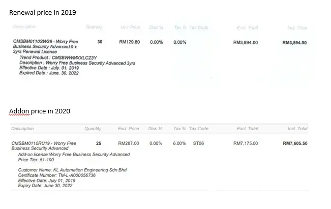 I'm wanted to add on the license for this particular antivirus in my organization, but the price per license is double now in 2020 when we last renew in 2019. Because of the price, we would like to give a try to other brand antivirus. If the price can be maintained, we will stay with Trend Micro and add more licensed to existing antivirus.