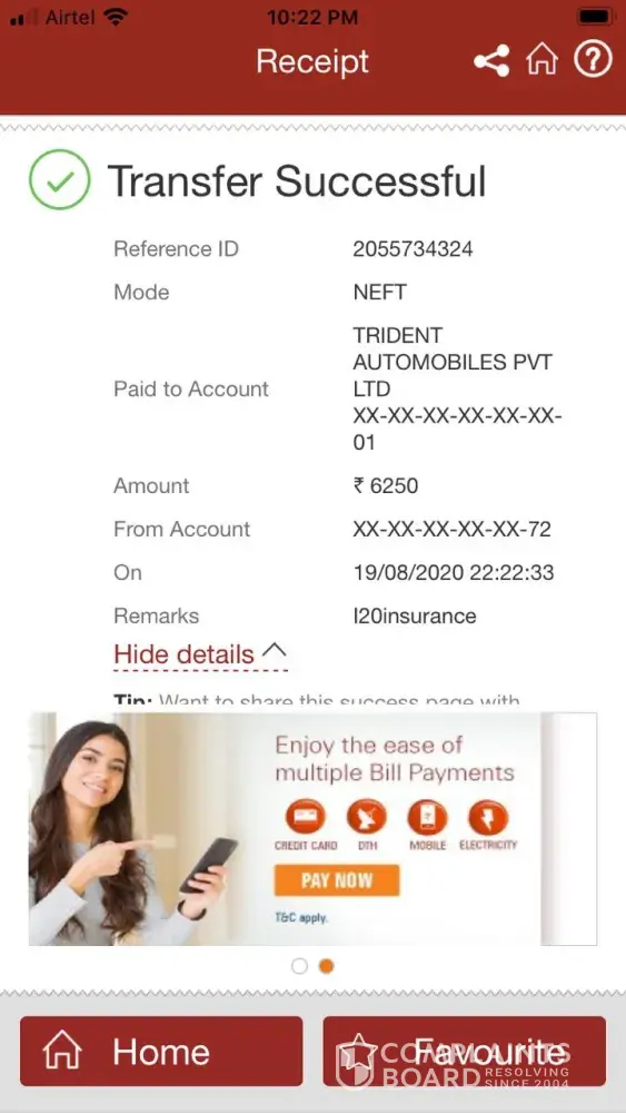 I had paid inr 6250 on august 19, 2020 for my i20 car (ka 01 mj 5447) insurance renewal as your executive called me and requested me to pay this amount in 2 months advance, my actual car insurance expiry date is october 16, 2020. Since she followed up and requested a lot of times I made the payment in advance. Attached the payment transfer receipt.