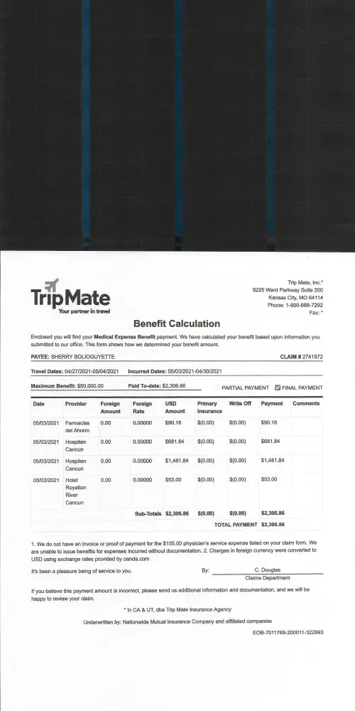 I purchased travel insurance with tripmate for my recent trip. I became ill while in Mexico and incurred medical expenses to the sum of $3000 plus. I filed a claim on May 7, 2021. When checking the claim status online, there is o information. Claim # is 7011769. I have called Trip Mate multiple times over the course of two weeks and cannot get any one to speak to. I have emailed with no response. How am I supposed to resolve this when nobody will respond to my calls or emails?