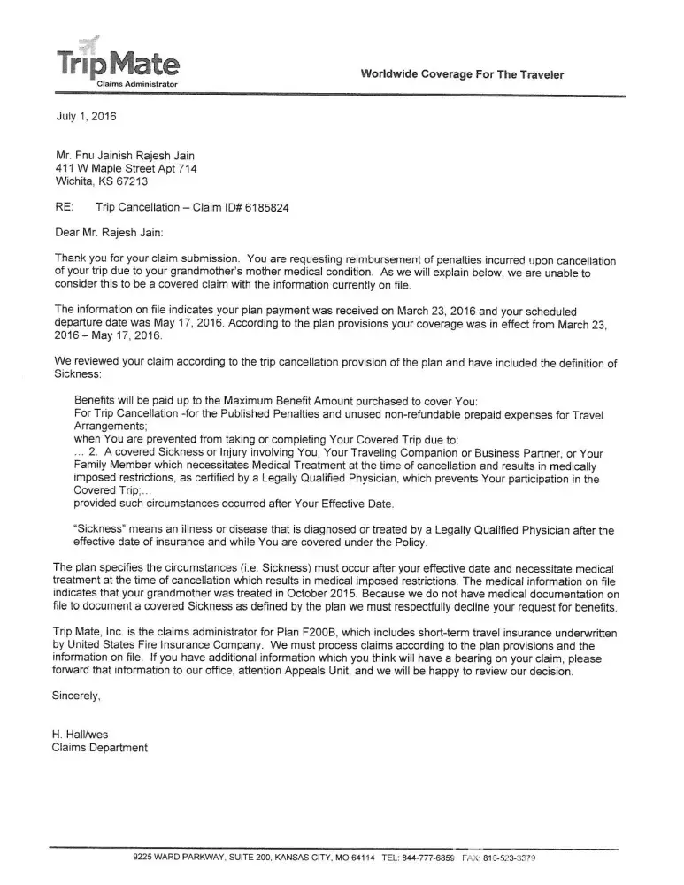I have a bad experience with Tripmate. I am in the insurance business and I am pretty sure this company is a fraud. I traveled abroad to see my ailing mother on Dec 19th 2015. Booked return trip for Jan 22nd. On Jan 21st doctor mentioned about deteriorating health of my mother and I decided to cancel the trip, Later her health stabilized a little and decided to fly back on Jan 27th. I filed claim with all doctor's notes and chronological events and trust me -- I know insurance and this claim is legitimate and they are delaying and finally denied. I will pursue with commissioner and Attorney generals office.